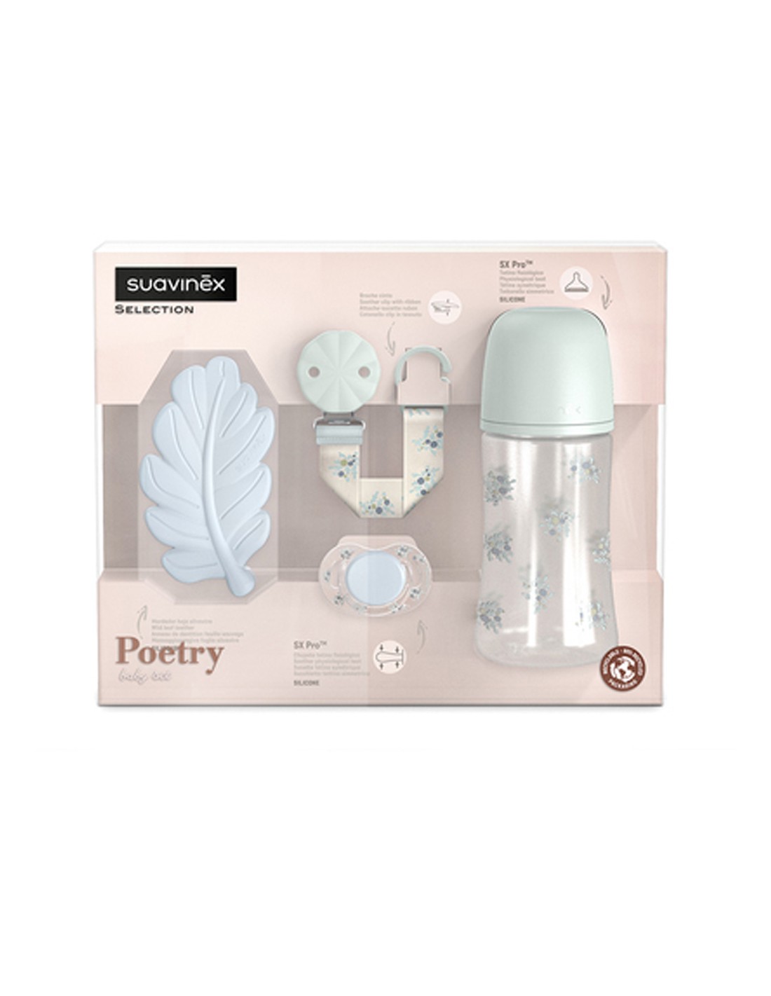 El Suavinex Set Regalo Poetry incluye una biberón, un chupete, una cadena y un mordedor, todo decorado con un diseño poético y elegante.
