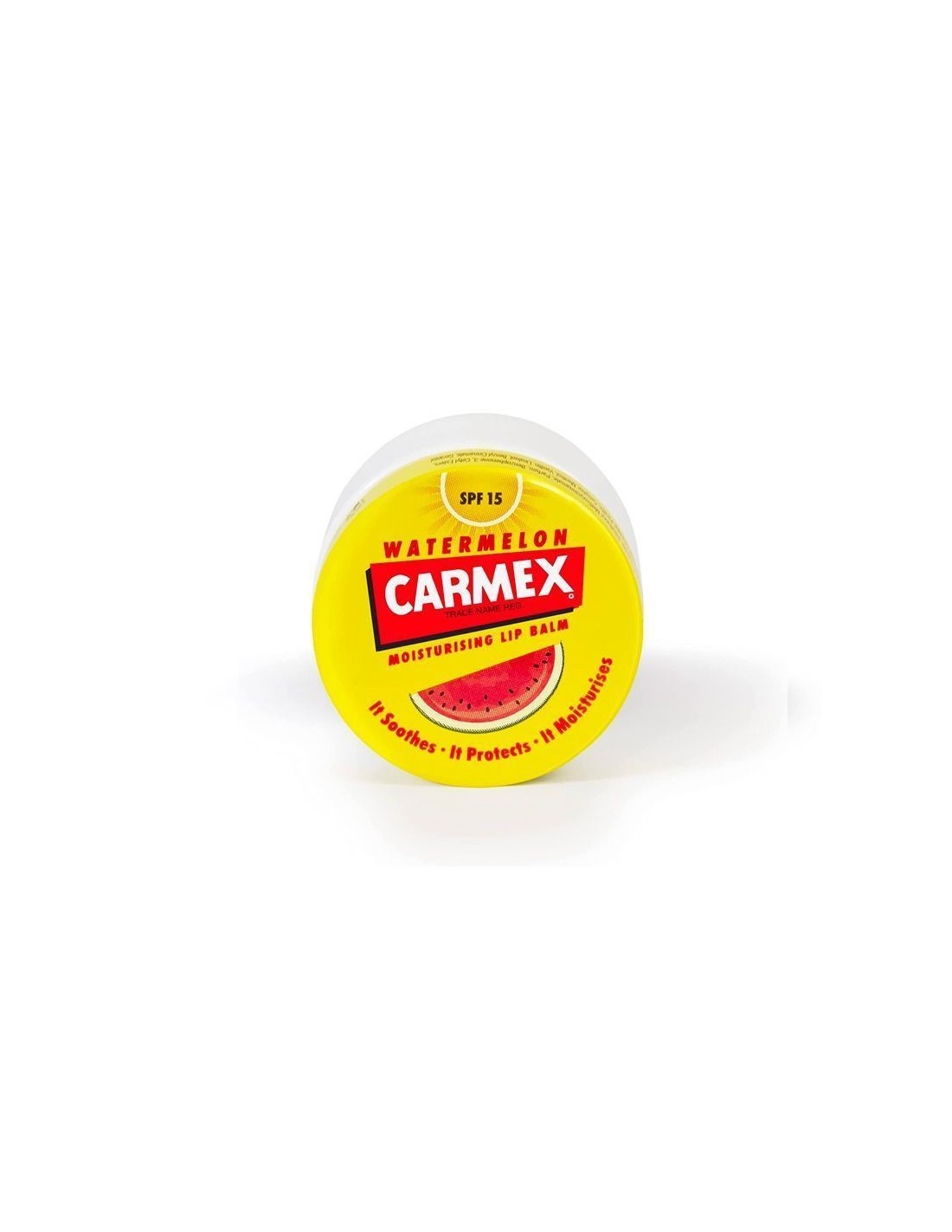 Carmex Watermelon SPF15 Tarro 7.5g El tarro de Carmex® original, con sabor sandia y factor de protección solar SPF15. Proporciona una barrera protectora de larga duración que ayuda a promover la curación de los labios. Se desliza suavemente. Refresca y suaviza los labios con alcanfor y mentol