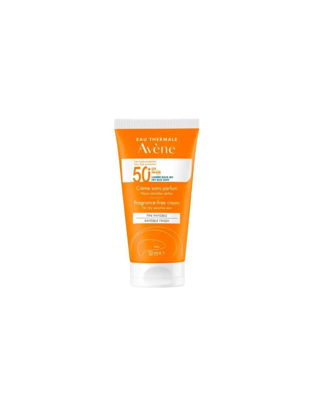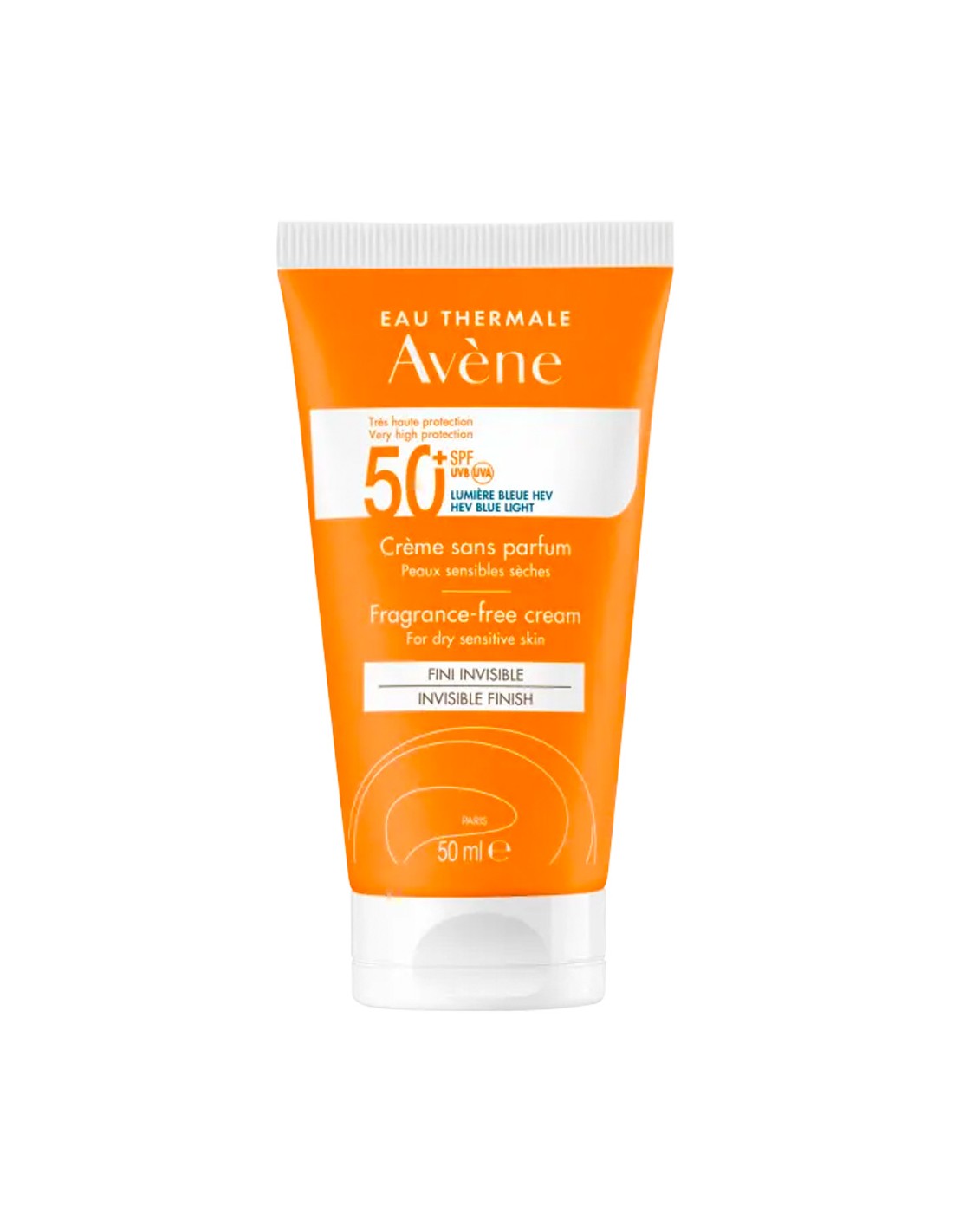 Avene Solar Crema Sin Perfume SPF50 50ml Protección solar muy alta SPF50+ para la piel seca y sensible del rostro. Un nuevo filtro solar patentado para una protección óptima y un mayor respeto por el medioambiente.