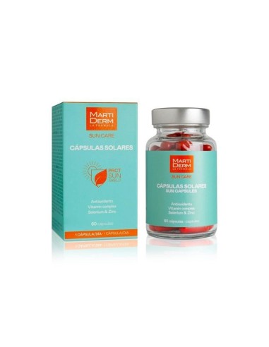 Martiderm Sun Care Capsulas 60u Complemento alimenticio que ayuda a preparar la piel para la exposición solar. Contiene extractos vegetales exclusivos ricos en polifenoles (Polypodium leucotomos, Cacao y Resveratrol) y ayuda a la protección de las células frente al daño oxidativo, gracias al elevado contenido en antioxidantes y vitaminas, y a la reparación del daño solar, gracias a la presencia de vitamina A, D y C, que contribuyen al funcionamiento normal del sistema inmunitario.