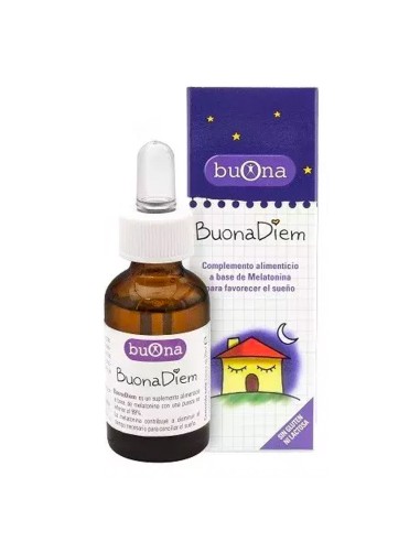BuonaBuona BuonaDiem Gotas 20ml es un complemento alimenticio a base de melatonina, con grado de pureza certificada del 99%, que favorece el sueño y el descanso nocturno ayudando a restablecer el ritmo sueño-vigilia. La melatonina es una molécula que nuestro organismo produce naturalmente. No se trata de un somnífero y no presenta efectos farmacológicos en la calidad y duración del sueño, pero favorece los ritmos fisiológicos gracias al efecto reconstituyente del ciclo sueño-vigilia. Se produce por las noches con una punta entre las 2 y las 4 de la mañana. De día su producción es mínima.