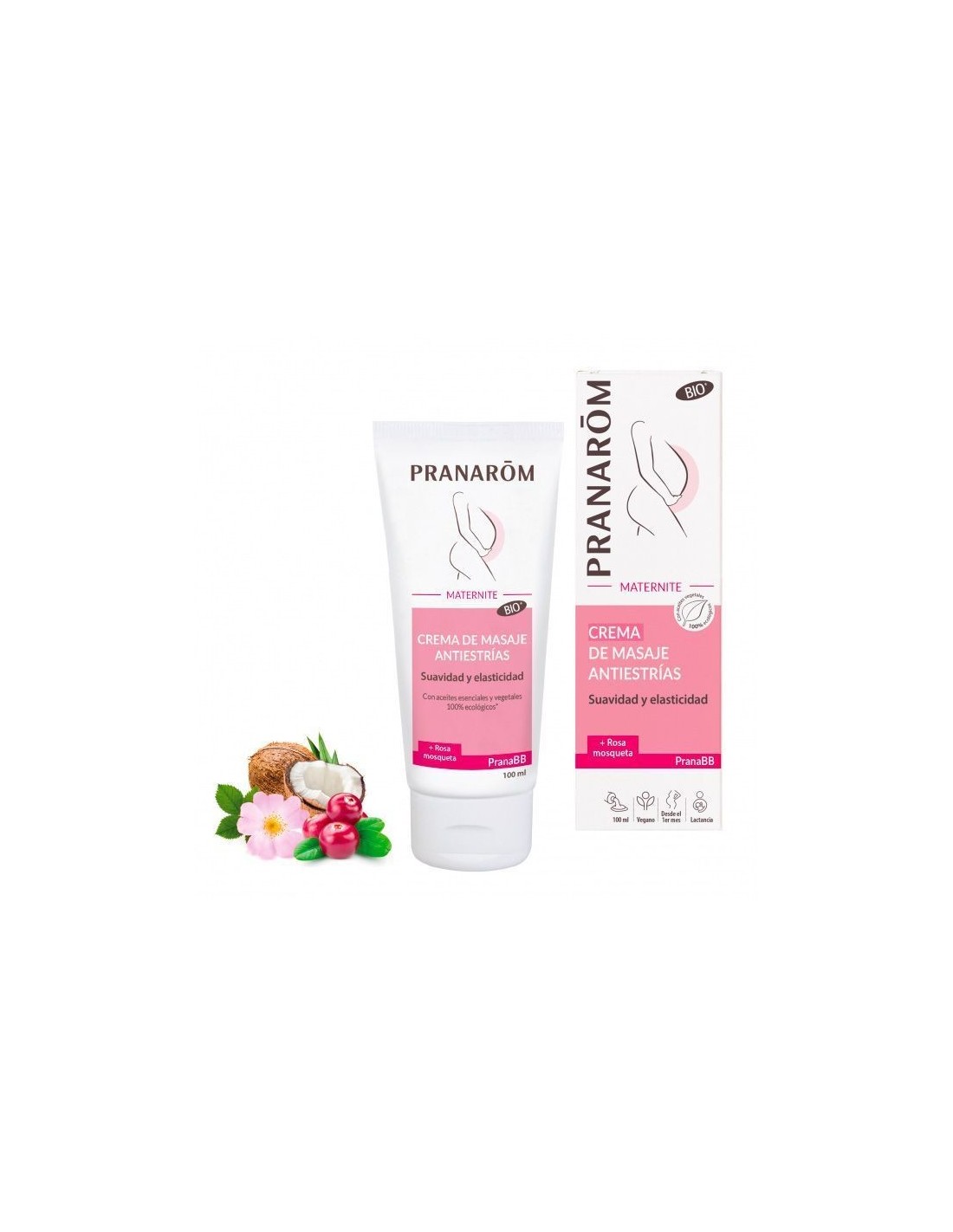 PranarômPranarom PranaBB Crema de Masaje Antiestrias BIO 100ml para la prevención de las estrías, rica en aceites vegetales nutritivos, mantiene la elasticidad de la piel y le aporta flexibilidad y confort. Los aceites esenciales de palo de rosa, siempreviva amarilla y jara completan de forma segura esta asociación de ingredientes naturales. Gracias a su textura ligera, penetra rápidamente y permite vestirse inmediatamente, dejando la piel suave y flexible. Esta crema también calma si hay picor o sensación de tirantez. Puede utilizarse durante la lactancia.