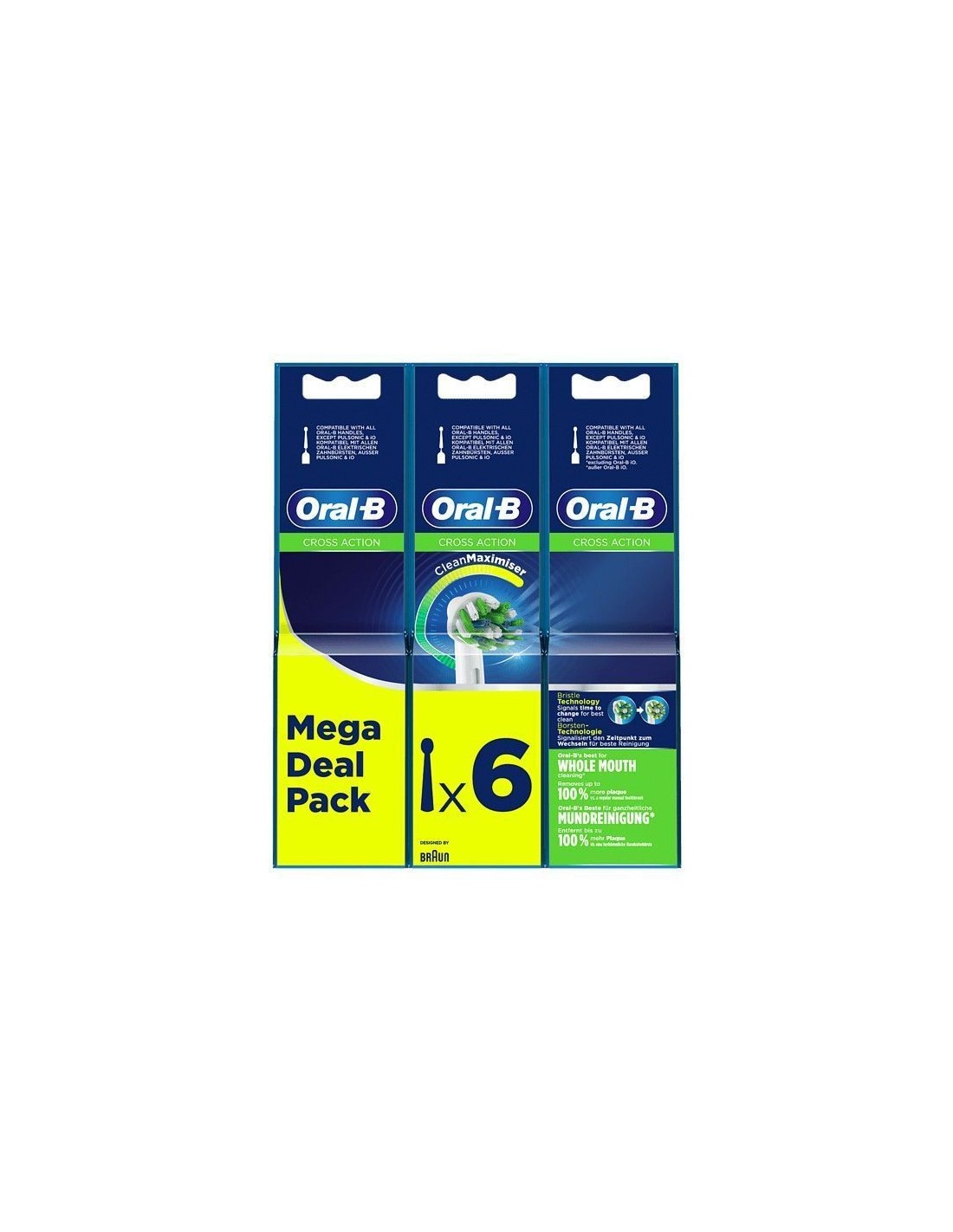Los cabezales de recambio CrossAction mejorados de Oral-B se desarrollan con la tecnología CleanMaximiser, que vuelve verdes los filamentos amarillos para proporcionar la mejor limpieza y un rendimiento óptimo del cabezal. Los filamentos únicos limpian en profundidad entre los dientes para eliminar la placa y dejar tu boca mucho más limpia que un cepillo de dientes manual normal. Compatible con todos los mangos Oral-B, excepto Pulsonic e iO.