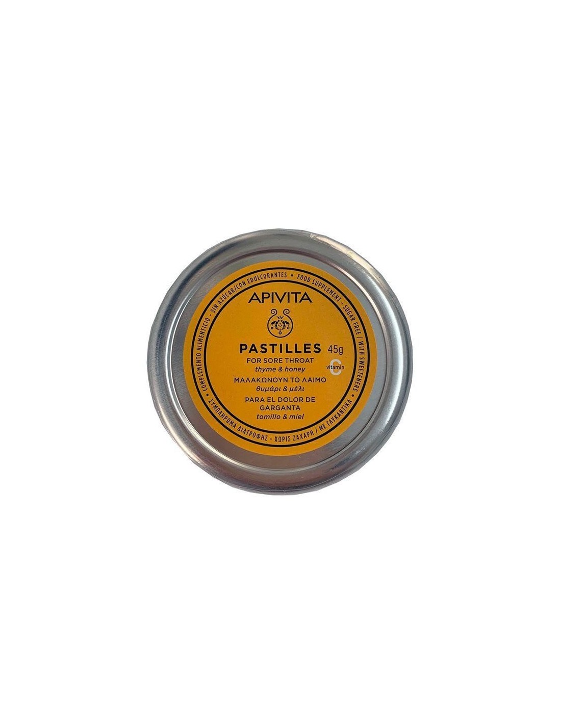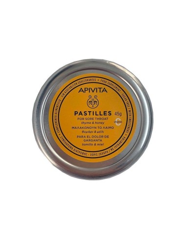 Apivita Pastillas Tomillo y Miel 45g Las pastillas de miel y tomillo son un complemento alimenticio para el dolor de garganta que combina el extracto de tomillo con los beneficios de la miel y la vitamina C.