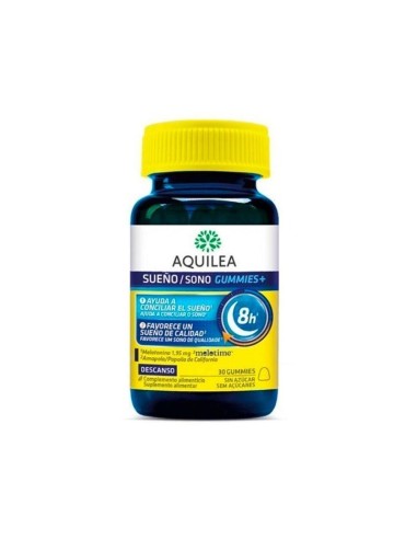 Aquilea Sueño 30 Gominolas es un complemento alimenticio que reduce el tiempo de conciliación del sueño y favorece un descanso reparador mediante el uso de Melatonina de liberación prolongada en gominolas sin azúcar con sabor a arándanos.