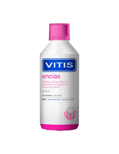 - Para una mayor eficacia es recomendable no aclarar con agua y evitar comer o beber inmediatamente después de su uso.VITIS encías colutorio está formulado especialmente para prevenir y ayudar a tratar la inflamación y el sangrado de encías.