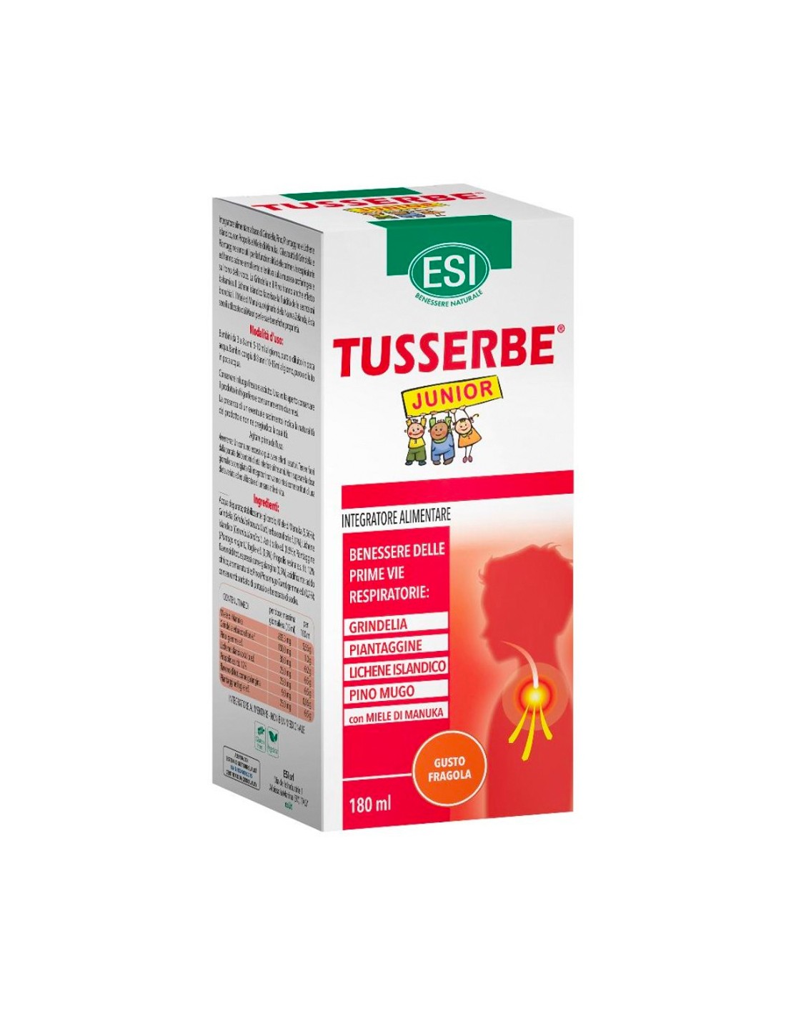 Esi tusserbe junior 180ml es un jarabe especialmente formulado para aliviar la tos en los niños. Complemento alimenticio para el bienestar de las vías respiratorias. Los extractos de Grindelia, Liquen Islandés y Plátano tienen una acción emoliente y calmante sobre la mucosa orofaríngea y sobre el tono de la voz. La Grindelia y el pino también tienen efecto balsámico. El liquen también favorece la fluidez de las secreciones bronquiales. La miel de Manuka ha sido utilizada por los maoríes durante siglos por sus propiedades beneficiosas. Sabor a fresa. Sin gluten , derivados lácteos , lactosa , colorantes artificiales, OGM. Apto para vegetarianos. Ingredientes Miel de Manuka, extracto fluido de hierba Grindelia con flores, extracto fluido de talo de liquen, extracto seco de propóleo titulado al 12% de flavonoides como galangina, extracto fluido de hojas de llantén, extracto fluido de yemas de pino. Excipientes: agua purificada; estabilizador: glicerol; acidulante: ácido cítrico; aromatizantes naturales; conservantes: sorbato de potasio y benzoato de sodio.