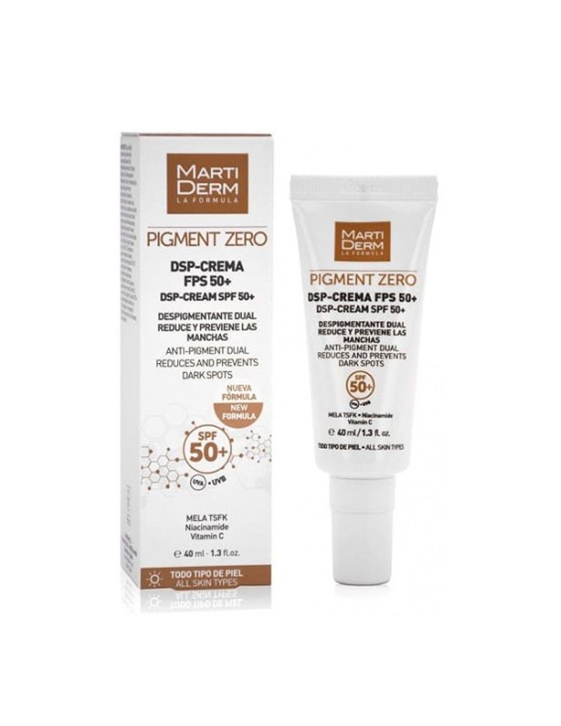 Martiderm Pigment Zero DSP Crema SPF50 estrena nueva fórmula basada en innovadores activos despigmentantes y fotoprotectores de última generación, convirtiéndose en un producto excepcional para el tratamiento de manchas durante el día: reduce y previene la aparición de manchas melánicas o hiperpigmentaciones, protege la piel de las radiaciones solares, unifica el tono, hidrata y aporta un potente efecto antioxidante. Además, su nueva textura fluida ligera permite aplicarla fácilmente dejando una agradable sensación de confort.