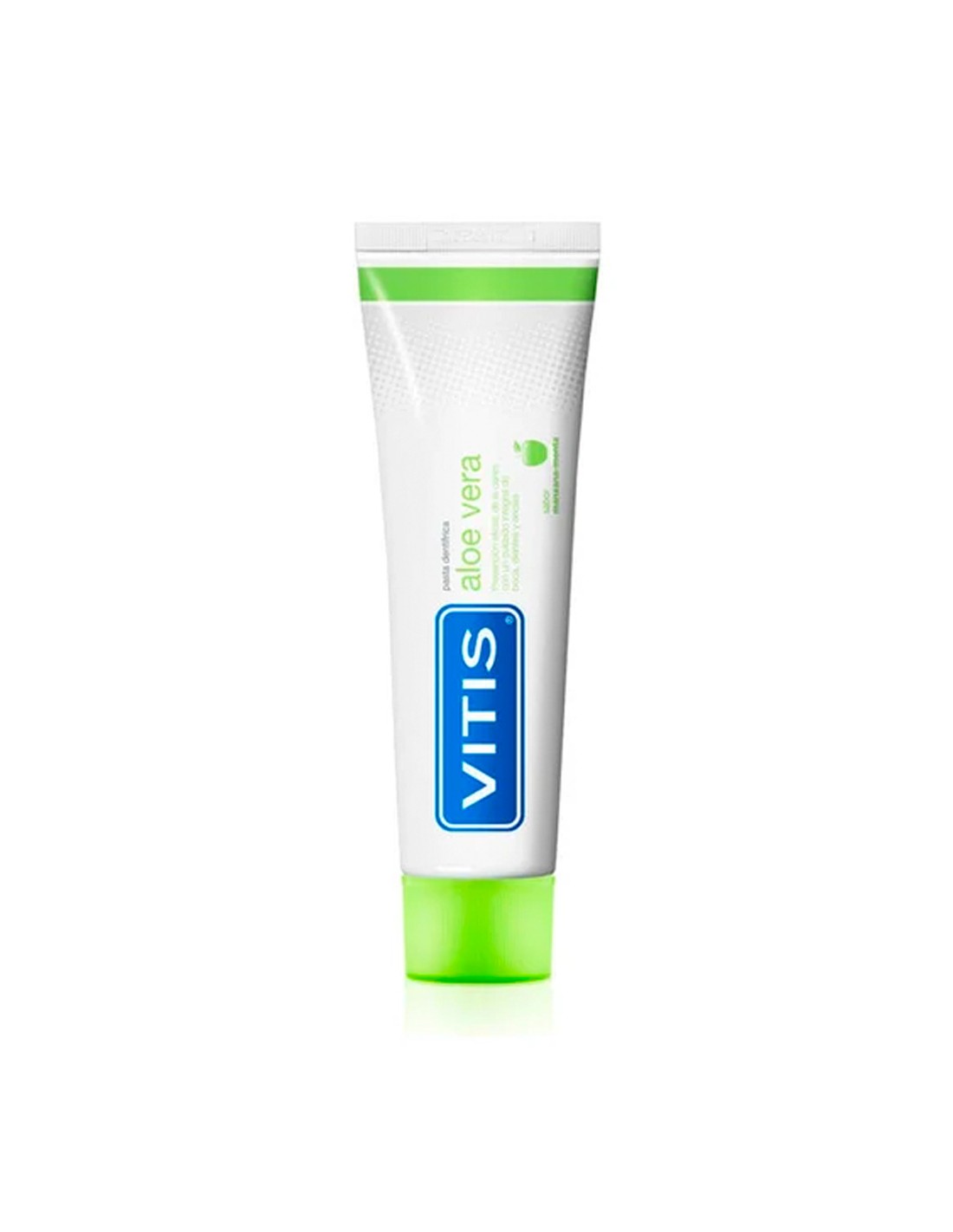 Vitis Aloe Vera Pasta Dentifrica Manzana Menta es la pasta dentífrica de uso diario especialmente formulada para prevenir eficazmente la caries y la formación de placa bacteriana