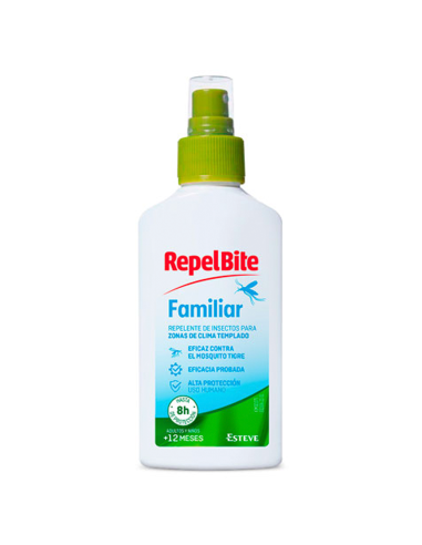 RepelBite Familiar Spray 100ml es un repelente de insectos especialmente formulado para proteger a toda la familia de picaduras de mosquitos, garrapatas y otros insectos molestos.