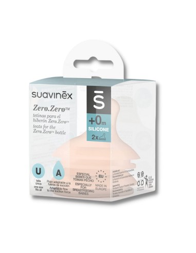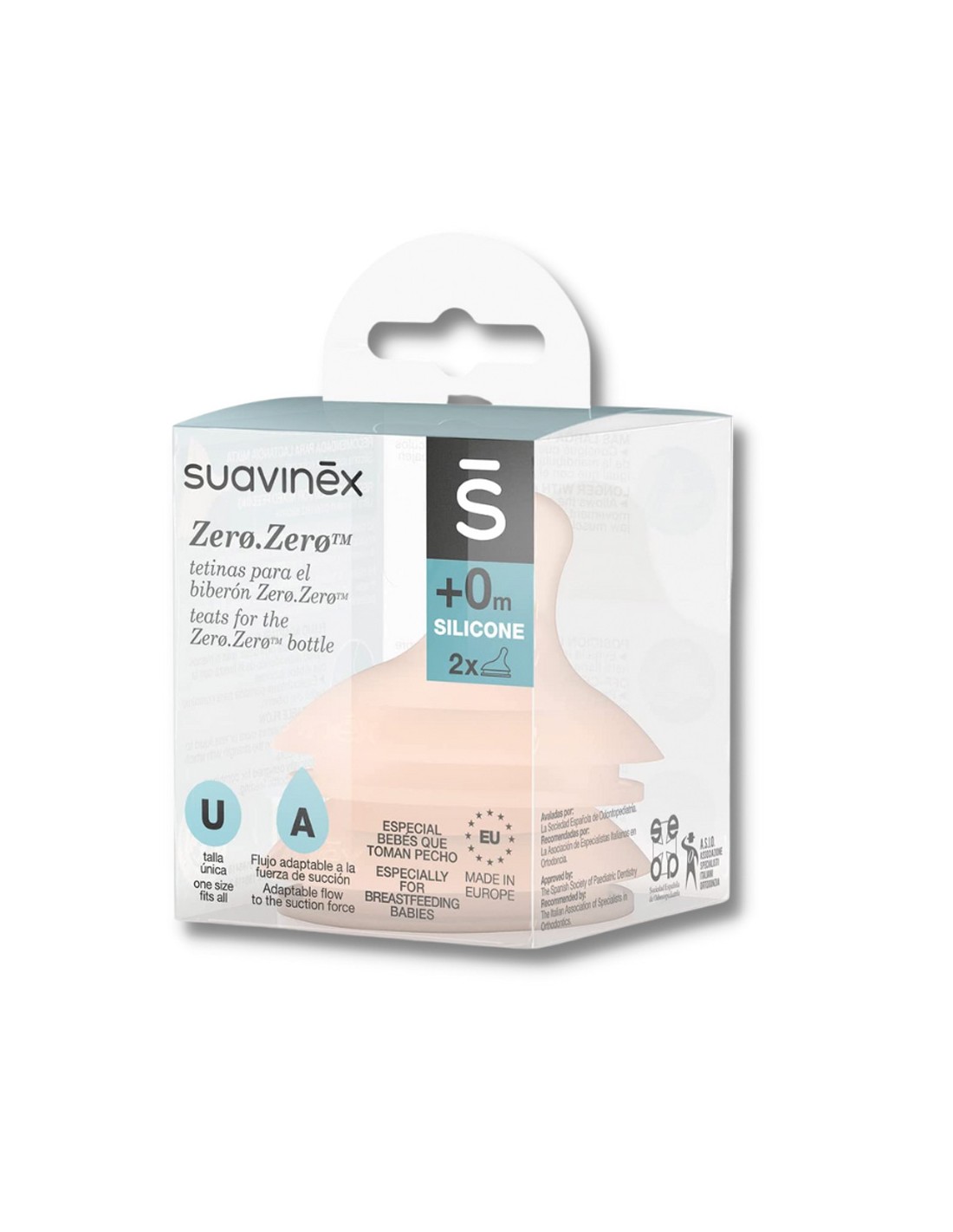 Las tetinas Suavinex Zero Flujo A están diseñadas para bebés de 0 meses en adelante y vienen en un pack de 2 unidades. Son ideales para ayudar a prevenir cólicos y facilitar la transición del pecho al biberón.