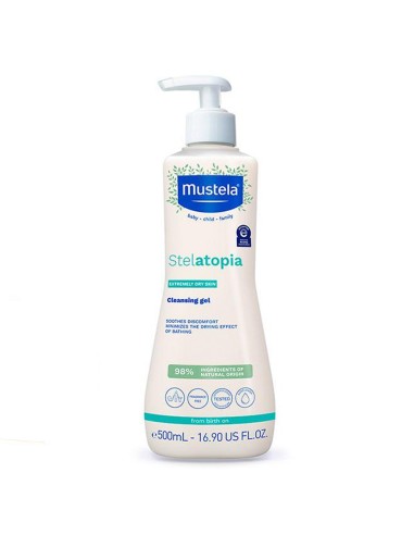 El Mustela Stelatopia Gel Lavante 500ml es un gel de baño especialmente formulado para bebés y niños con piel seca o con tendencia atópica. Su fórmula suave y sin jabón ayuda a limpiar la piel sin resecarla, respetando su equilibrio natural.